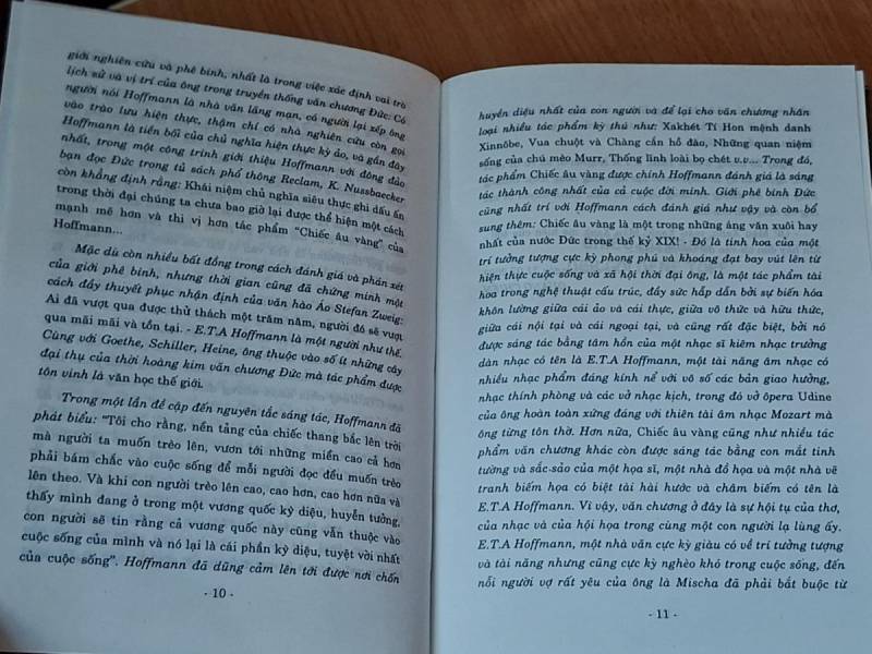 Đó là tinh hoa của một trí tưởng tượng cực kỳ phong phú và khoáng đạt bay vút lên từ hiện thực cuộc sống và xã hội thời đại ông, là một tác phẩm tài hoa trong nghệ thuật cấu trúc, đầy sức hấp dẫn bởi sự biến hóa khôn lường giữa cái ảo và cái thực, giữa vô thức và hữu thức, giữa cái nội tại và cái ngoại tại, và cũng rất đặc biệt, bởi nó được sáng tác bằng tâm hồn của một nhạc sĩ kiêm nhạc trưởng dàn nhạc phẩm đáng kính nể với vô số các bản giao hưởng, nhạc thính phòng và các vở nhạc kịch, trong đó vở ôpêra Udine của ông hoàn toàn xứng đáng với thiên tài âm nhạc Mozart mà ông từng tôn thờ. Hơn nữa, CHIẾC âu VÀNG cũng như nhiều tác phẩm văn chương khác còn được sáng tác bằng con mắt tinh tường và sắc sảo của một học sĩ, một nhà đồ học và một nhà vẽ tranh biếm họa có biệt tài hài hước và châm biếm có tên là E.T.A Hoffmann.