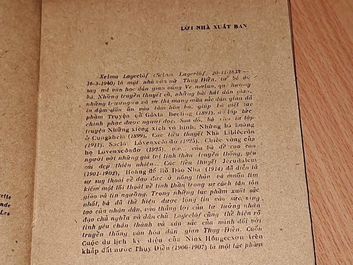 Tác giả: XENMA LAGECLOP ( Tô Chương , Ngọc Thọ dịch ) NXB: Văn Học 1986, 316 trang khổ 13x19cm. Sách tốt , bìa dán băng dính trắng, ruột tốt. Tác giả của giải NOBEL NĂM 1919 .