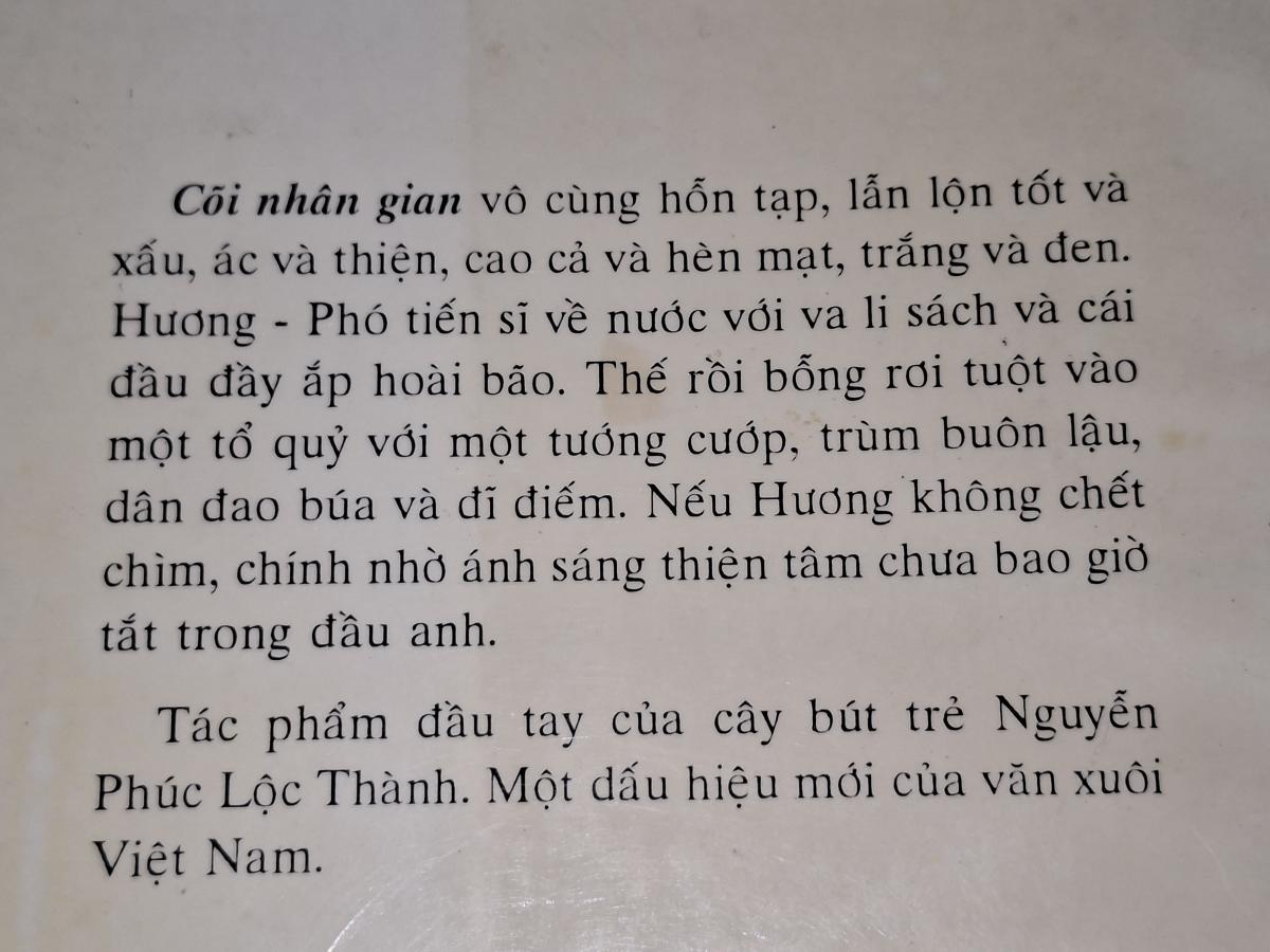 Côi nhân gian vô cùng hỗn tạp, lẫn lộn tốt và xấu, ác và thiên, cao cả và hèn mạt, trắng và đen. Hương - Phó tiến sĩ về nước với va li sách và cái đầu đầy ắp hoài bão. Thế rồi bống rơi tuột vào một tổ quỷ với một tướng cướp, trùm buôn lậu, dân đao búa và đĩ điếm. Nếu Hương không chết chìm, chính nhờ ánh sáng thiện tâm chưa bao giờ tất trong đầu anh.