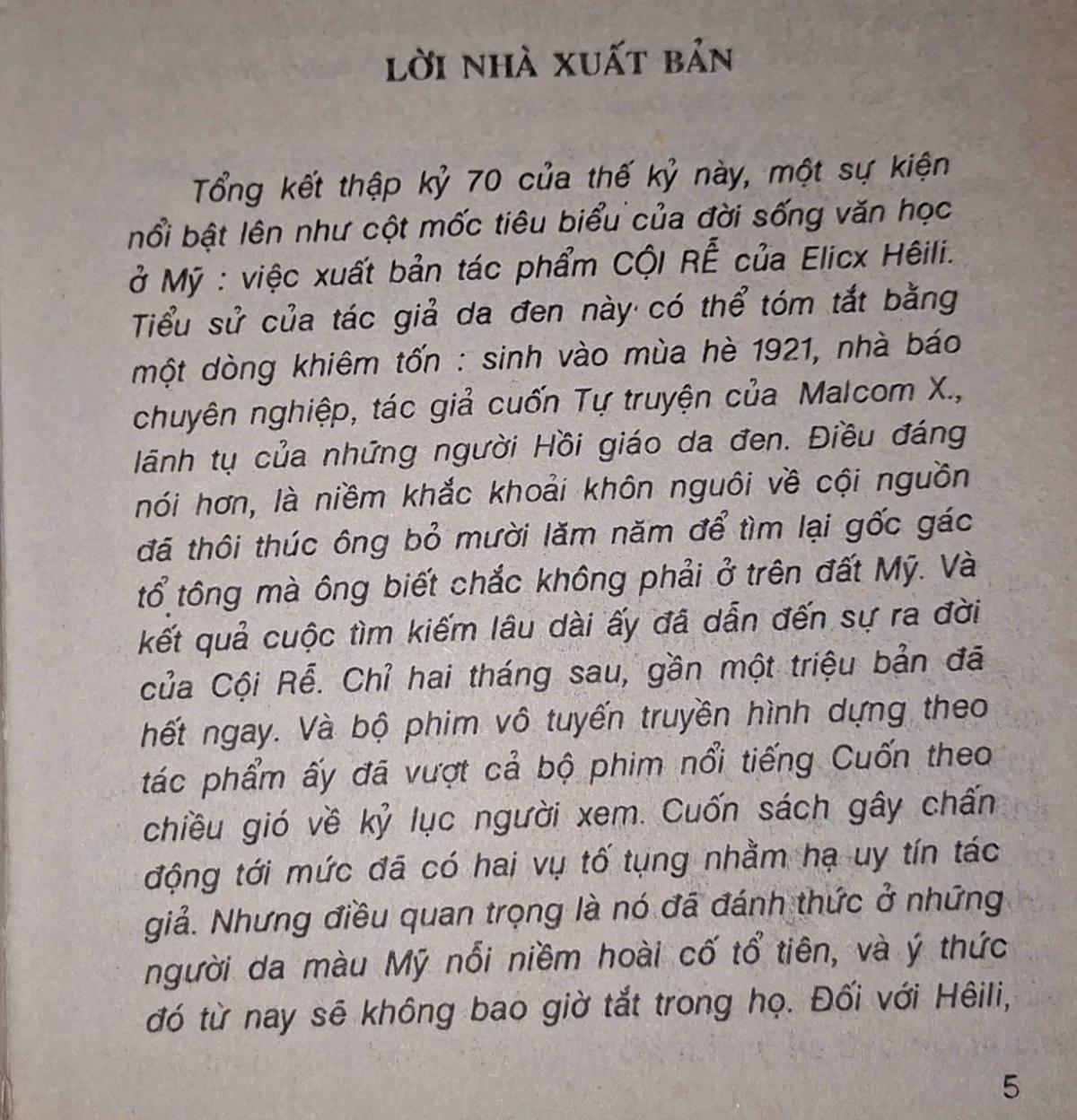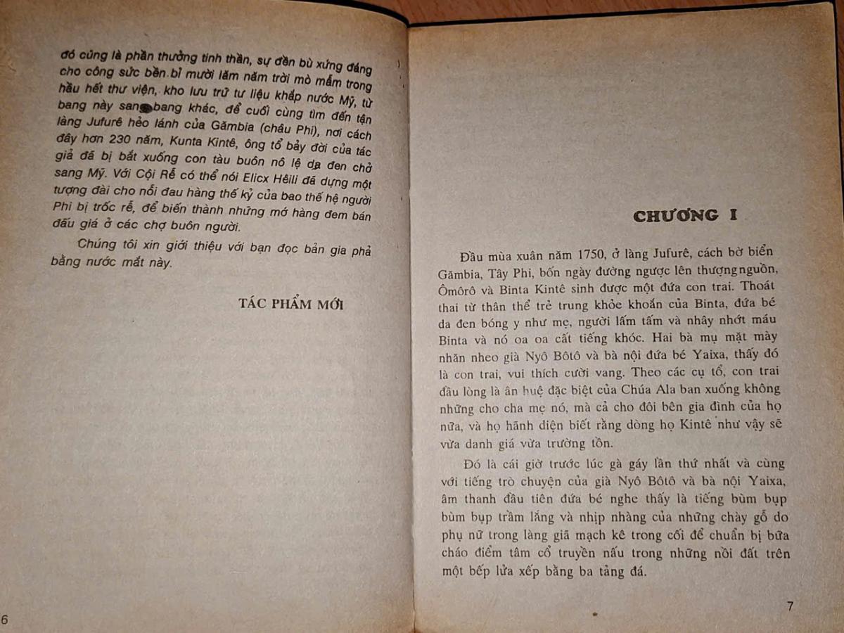 "Cội Rễ" của Alex Haley, một tiểu thuyết viết về hành trình đi tìm nguồn cội của một nhà văn Mỹ gốc Phi đã đột nhiên xuất hiện “như một niềm kinh dị” trong xã hội Mỹ, (mượn ý của Hoài Thanh) kể cả những vùng thôn quê bình lặng, lẫn chốn phồn hoa đô hội; cả ở những đám người bình dân lẫn trong các tầng lớp quý tộc Hoa Kỳ.