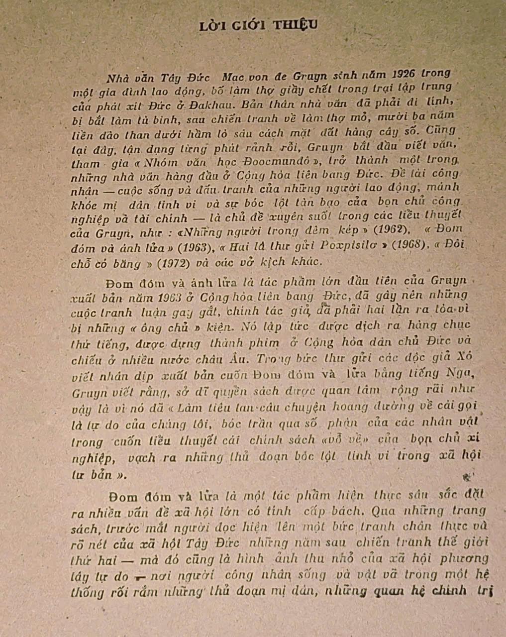 Đom đóm và lửa là tác phẩm lớn đầu tiên của Gruyn xuất bản năm 1963 ở Cộng hòa liên bang Đức, đã gây nên những cuộc tranh luận gay gắt, chính tác giả đã hai lần ra tòa vì bị những “ông chủ” kiện. Nó lập tức được dịch ra hàng chục thứ tiếng, được dựng thành phim ở Cộng hòa dân chủ Đức và chiếu ở nhiều nước Châu Âu. Trong bức thư gửi của độc giả Xô Gruyn viết rằng, sở dĩ quyển sách được quan tâm rộng rãi như vậy là vì nó đã “Làm tiêu tan câu chuyện hoang đường về cái gọi là tự do của chúng tôi, bóc trần qua số phận của các nhân vật của cuốn tiểu thuyết cải chính sách “vỗ về” của bọn chủ xí nghiệp, vạch ra những thủ đoạn bóc lột tinh vi trong xã hội tư bản”.