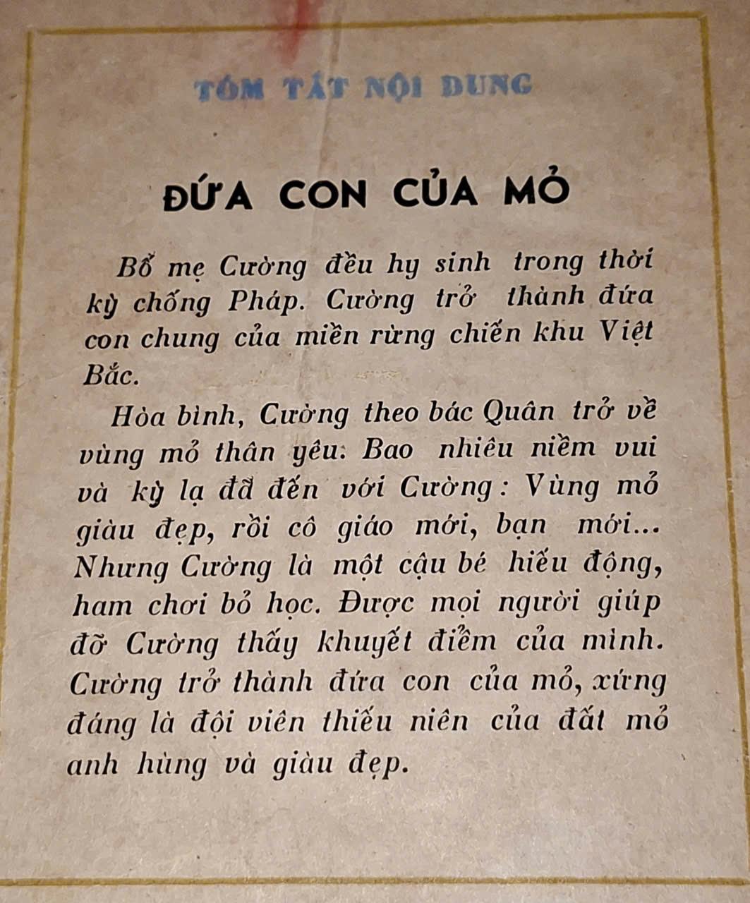 Hòa bình, Cường theo bác Quân trở về vùng mỏ thân yêu: Bao nhiêu niềm vui và kỳ lạ đã đến với Cường: Vùng mỏ giàu đẹp, rồi cô giáo mới, bạn mới... Nhưng Cường là một cậu bé hiếu động, ham chơi bỏ học. Được mọi người giúp đỡ Cường thấy khuyết điểm của mình. Cường trở thành đứa con của mỏ, xứng đáng là đội viên thiếu niên của đắt mỏ anh hùng và giàu đẹp.