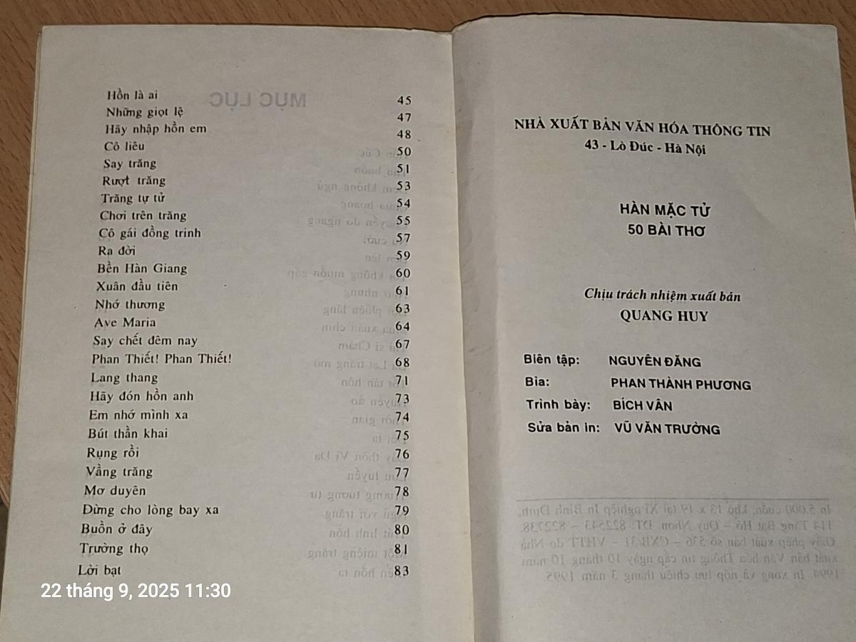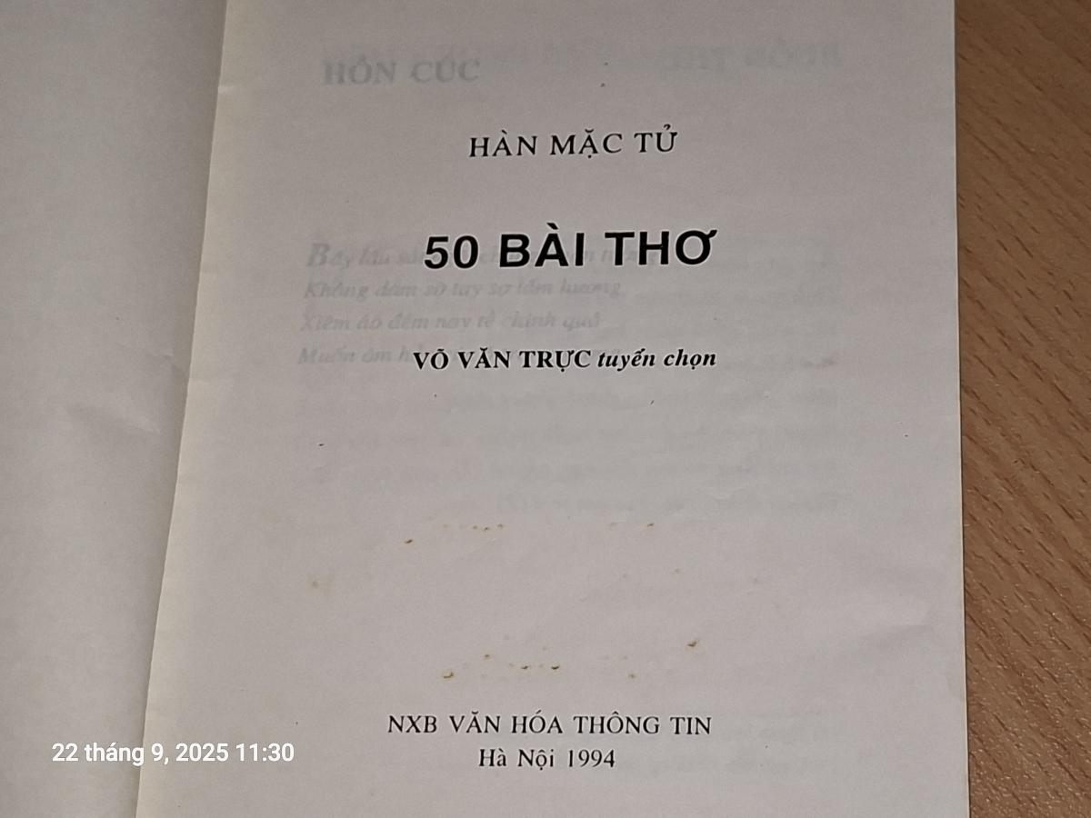 Hàn Măc Tử 50 Bài Thơ Tác giả: Hàn Mặc Tử ( Võ Văn Trực tiếp tuyển chọn ) NXB VĂN HÓA THÔNG TIN 1994 , 88 trang khổ 13X19cm. Sách tốt. 40k