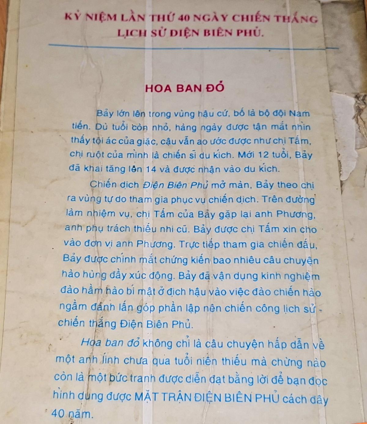 Hoa Ban Đỏ không chỉ là câu chuyện hấp dẫn về một anh Íinh chưa qua tuổi niên thiếu mà chừng nào còn là một bức tranh được diễn đạt bằng lời để bạn đọc hình dung được MẶT TRẬN ĐIỆN BIÊN PHỦ cách đây 70 năm.