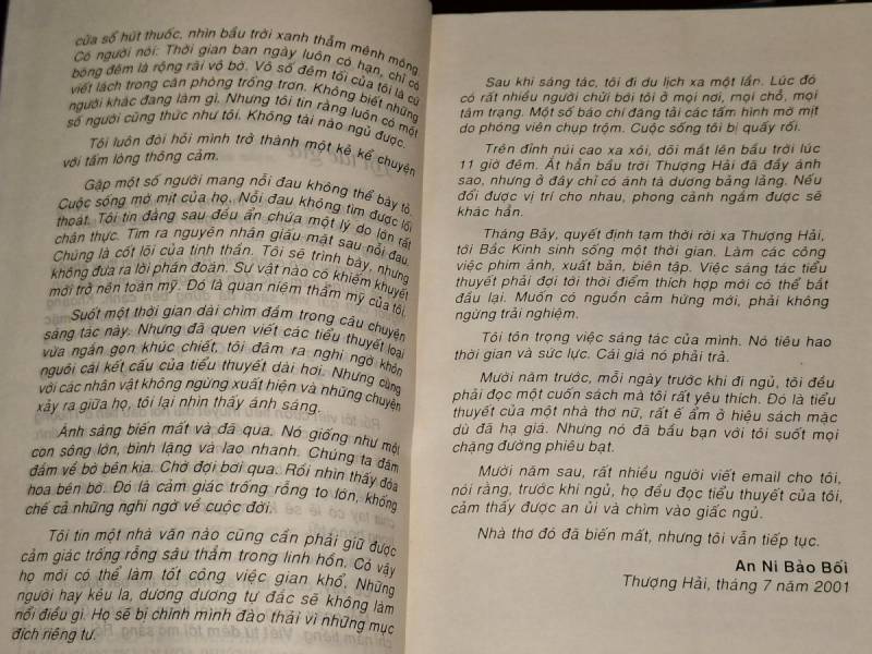 ... Tôi tôn trọng việc sáng tác của mình. Nó tiêu hao thời gian và sức lực. Cái giá nó phải trả. Mười năm trước, mỗi ngày trước khi đi ngủ, tôi đều phải đọc một cuốn sách mà tôi rất yêu thích. Đó là tiểu thuyết của một nhà thơ nữ, rất ế ẩm ở hiệu sách mặc dù đã hạ giá. Nhưng nó đã bầu bạn với tôi suốt mọi chặng đường phiêu bạt. Mười năm sau, rất nhiều người viết email cho tôi, nói rằng trước khi ngủ, họ đều đọc tiểu thuyết của tôi, cảm thấy được an ủi và chìm vào giấc ngủ. Nhà thơ đó đã biến mất, nhưng tôi vẫn tiếp tục.
