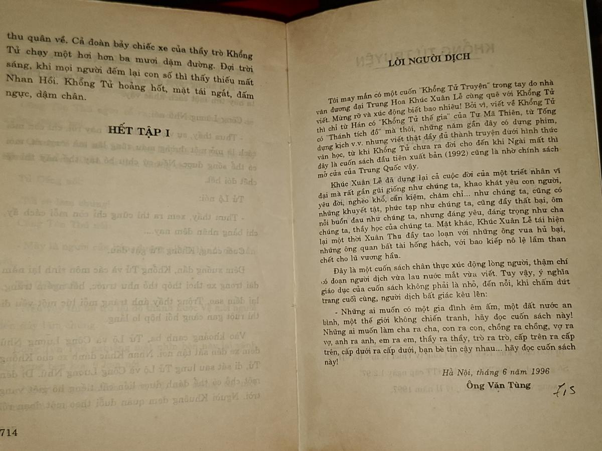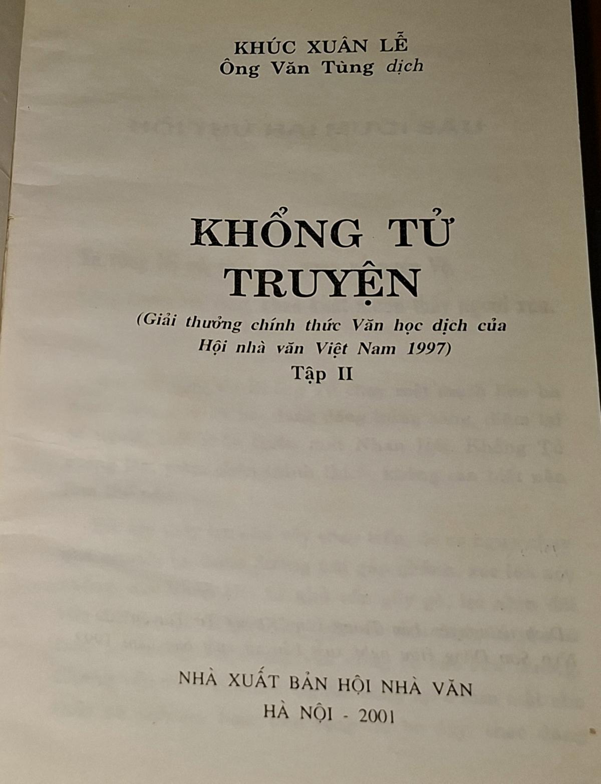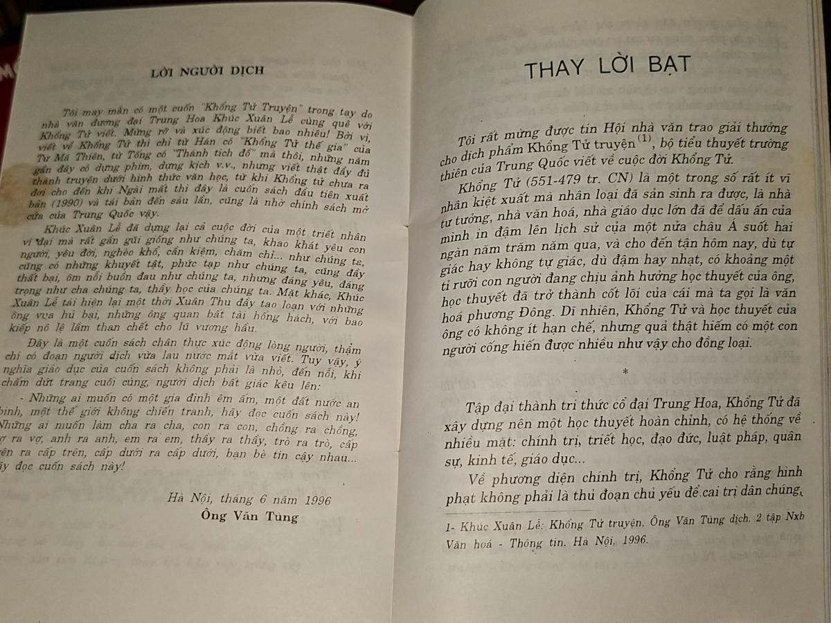 "Tôi may mắn có một cuốn "Khổng Tử Truyện " trong tay do nhà văn đương đại Trung Hoa Khúc Xuân Lễ cùng quê với Khổng Tử viết. Mừng rỡ và xúc động biết bao nhiêu ! Bởi vì, viết về Khổng Tử thì chỉ từ Hán có "Khổng Tử thế gia " của Tư Ma Thiên, từ Tống có "Thánh tích đồ" mà thôi, những năm gần đây có dựng phim, dựng kịch v.v. nhưng viết thật đầy đủ thành truyện duới hình thức văn học, từ khi Khổng Tử chưa ra đời cho đến khi Ngài mất thì đây là cuốn sách đầu tiên xuất bản (1992) cũng là nhờ chính sách mở cửa của Trung Quốc vậy.