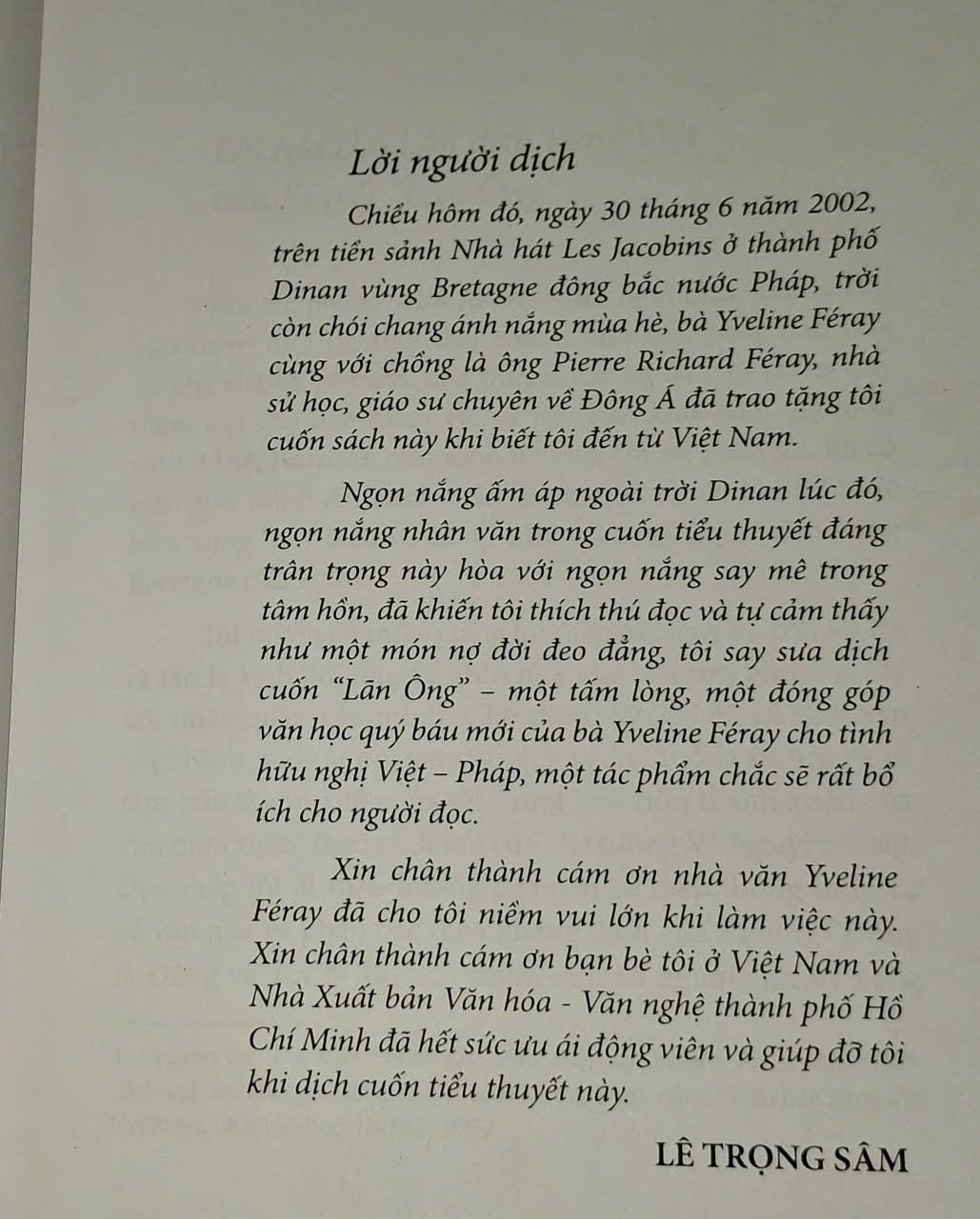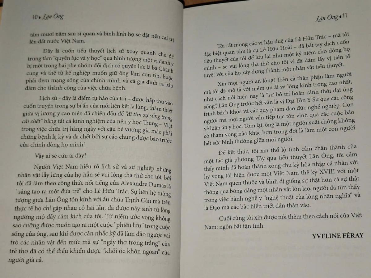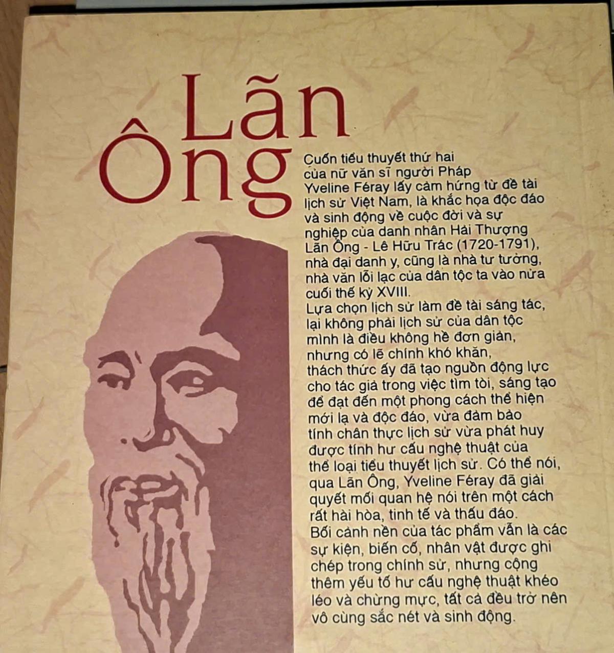 Sau tác phẩm Vạn xuân, Yvéline Féray nghĩ rằng không cần viết thêm một từ, một dấu chấm, một dấu phẩy nào nữa về Đại Việt và về cuốn tiểu thuyết mà bà đã cưu mang bảy năm, trải qua bao niềm vui và nỗi gian khó… Việt Nam luôn nằm ở dạng tiềm ẩn mà lần này dưới những nét đặc sắc của vị danh y thế kỷ XVIII Lê Hữu Trác (biệt hiệu Lãn Ông – Ông Lười) - một người coi thường vinh hoa phú quý để được buông mình theo thú lười. Với Lê Hữu Trác, tác giả đã đọc qua Thượng kinh ký sự và nhiều công trình nghiên cứu của các thầy thuốc người Pháp ca ngợi ông để từ đó hình thành nên những trang viết sinh động, giàu cảm xúc. Lê Hữu Trác là người theo triết lý vô vi của Lão giáo, đi sâu nghiên cứu y học và hết lòng với người bệnh, đào tạo học trò và mơ ước “mọi người đều có sức khỏe tốt để mình được hoàn toàn thảnh thơi ngâm thơ và uống rượu nơi chốn ẩn cư”… Trở lại thời gian cuộc hành trình chín tháng ở kinh đô Thăng Long; ta tưởng tượng thay cho ông một cuộc hành trình khác với chuyến đi mà ông đã kể trong Thượng kinh ký sự, đưa ông đến với người bệnh nhỏ tuổi – Thế tử Trịnh Cán mới 7 tuổi, sớm thông minh và rất mực khôn ngoan – một câu chuyện độc đáo. Chuyện về vị y sư đáng kính bị chao đảo bởi cuộc chiến đấu thầm lặng đầy hiểm nguy để giành lại sự sống từ trong cái chết… Để làm việc này, nữ văn sĩ đã nghiên cứu tất cả chi tiết của phần lịch sử tiểu thuyết, đắm mình vào thời kỳ được ghi lại trong Hoàng Lê nhất thống chí, ghi chép những sự kiện diễn ra ở Việt Nam từ những năm 1768 đến 1802, văn bản lịch sử nằm trong bộ tiểu thuyết của Ngô gia văn phái và đặc biệt trong thời kỳ Chúa Trịnh Sâm (thân sinh của Trịnh Cán). Đây là cuốn tiểu thuyết lịch sử xoay quanh chủ đề trung tâm “quyền lực và y học” qua hình tượng một vị danh y bị một trong hai phe nhóm đối nghịch có quyền lực là bà Chánh cung và Thế tử kế nghiệp muốn giữ ông làm con tin, buộc phải đem mạng sống của chính mình và cả gia đình ra bảo đảm cho thành công của việc chữa bệnh. Lịch sử được hấp thu vào cuốn truyện trong sự bí ẩn của mối liên kết lạ lùng, thắm thiết giữa vị lương y cao niên đã chiến đấu để tìm sự sống bằng tất cả kinh nghiệm của nền y học Trung – Việt trong việc chữa trị hàng ngày với cậu bé vương gia mắc phải chứng bệnh lạ và chết bởi sự cáo chung được báo trước của chính dòng họ mình… Bà Yvéline Féray đã thổ lộ tình cảm chân thành của một tác giả phương Tây qua tiểu thuyết Lãn Ông, hy vọng tái hiện được một Việt Nam thế kỷ XVIII với một Việt Nam quen thuộc và bình dị giống sự thật hơn cả sự thật thông qua bóng dáng một nhân vật lớn lao, người đã tìm thấy trong việc hành nghề y “nghệ thuật của lòng nhân nghĩa” và là Đạo mà các bậc hiền triết dấn thân vào…