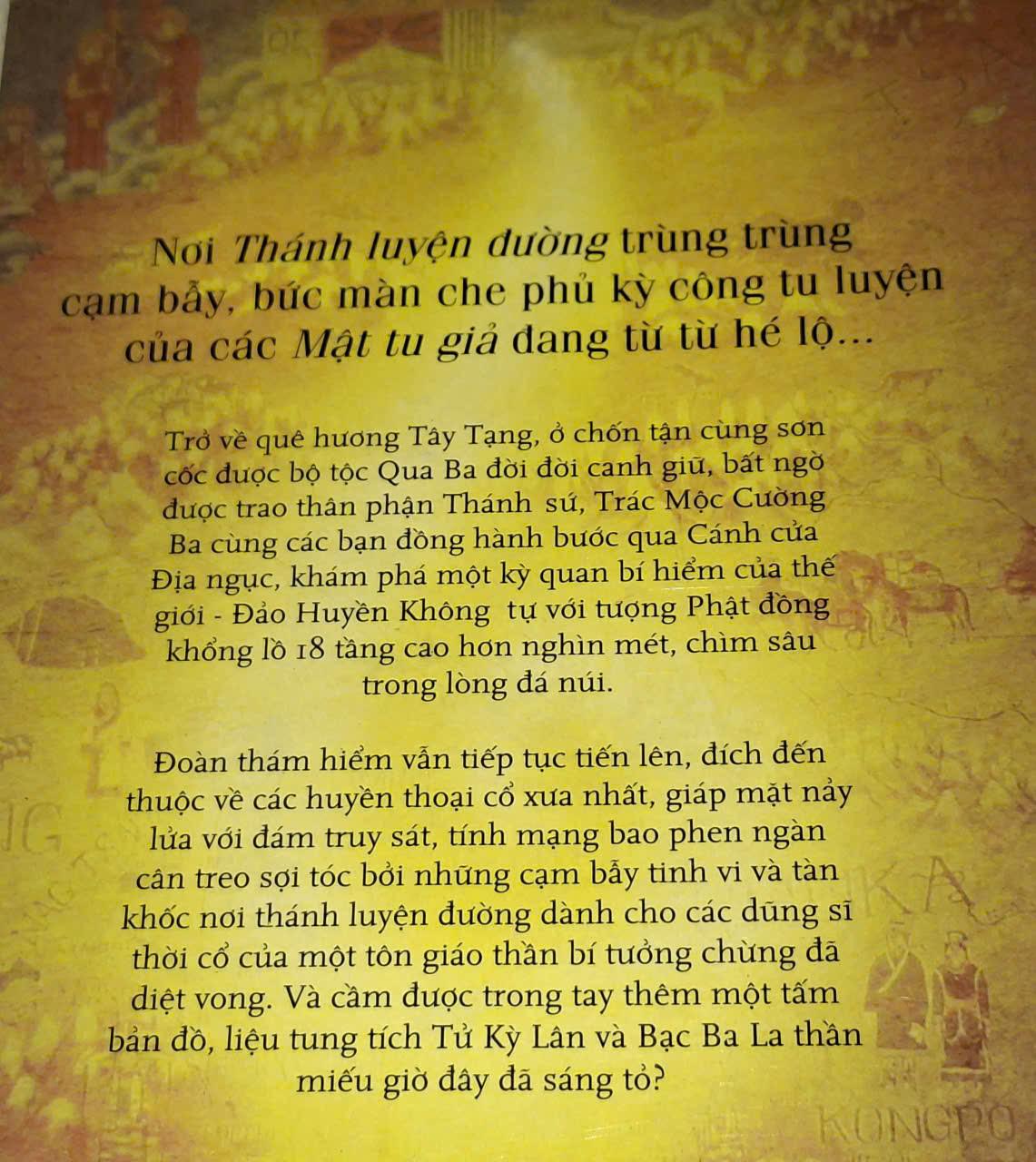 Đoàn thám hiểm vẫn tiếp tục tiến lên, đích đến thuộc về các huyền thoại cổ xưa nhất, giáp mặt nảy lửa với đám truy sát, tính mạng bao phen ngàn cân treo sợi tóc bởi những cạm bẫy tinh vi và tàn khốc nơi thánh luyện đường dành cho các dũng sĩ thời cổ của một tôn giáo thần bí tưởng chừng đã diệt vong. Và cầm được trong tay thêm một tấm bản đồ, liệu tung tích Tử Kỳ Lân và Bạc Ba La thần miếu giờ đây đã sáng tỏ?