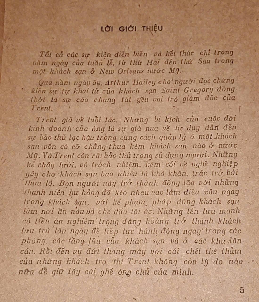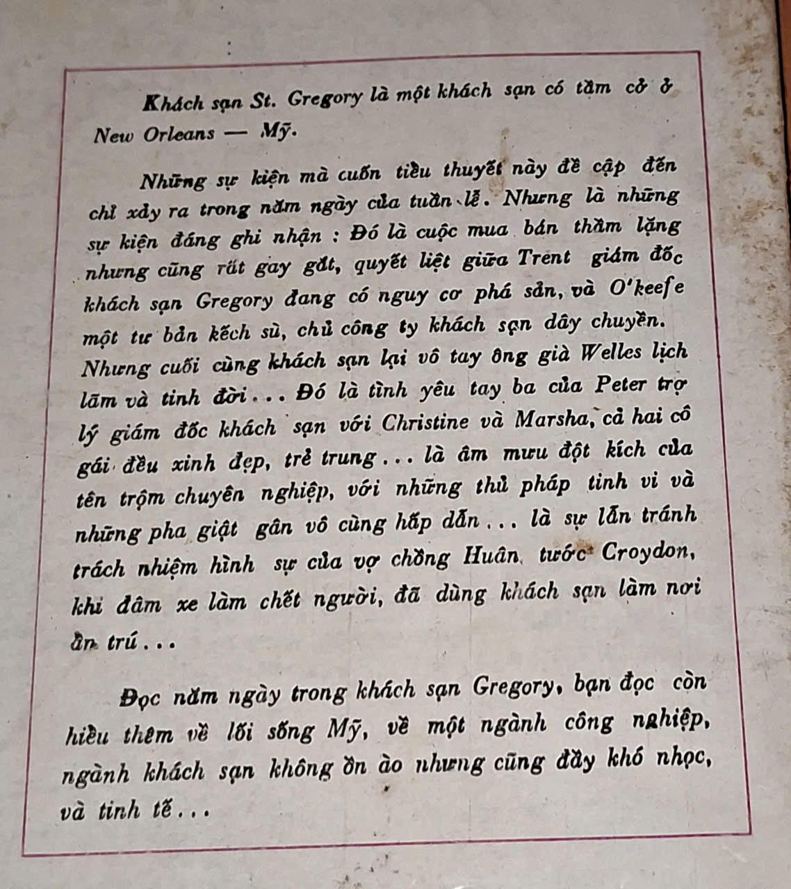 Những sự kiện mà cuốn tiểu thuyết này đề cập đến chỉ xảy ra trong năm ngày của tuần lễ. Nhưng là những sự kiện đáng ghi nhận : Đó là cuộc mua bán thầm lặng nhưng cũng rất gay gắt, quyết liệt giữa Trent giám đốc khách sạn Gregory đang có nguy cơ phá sản, và O'keefe một tư bản kếch sù, chủ công ly khách sạn dây chuyền. Nhưng cuối cùng khách sạn lại vô tay ông già Welles lịch lãm và tinh đời... Đó là tình yêu tay ba của Peter trợ lý giám đốc khách sạn với Christine và Marsha, cả hai cô gái đều xinh đẹp, trẻ trung... là âm mưu đột kích của tên trộm chuyên nghiệp, với những thủ pháp tinh vi và những pha giật gân vô cùng hấp dẫn... là sự lẫn tránh trách nhiệm hình sự của vợ chồng Huân tước Croydon, khi đâm xe làm chết người, đã dùng khách sạn làm nơi ẩn trú...