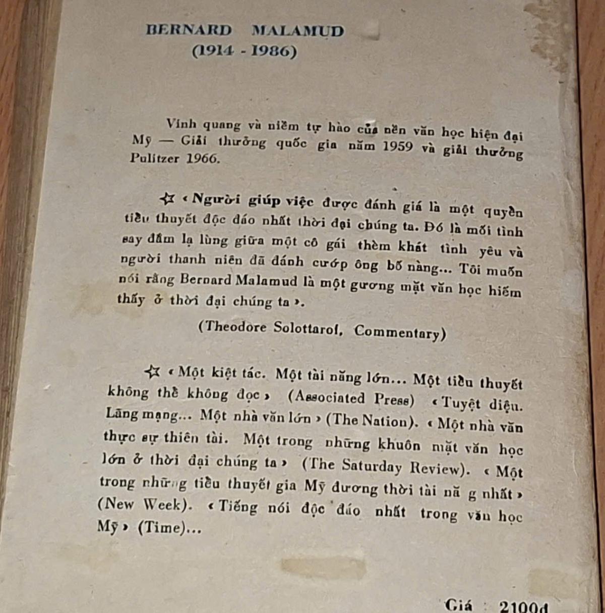 Bernard Malamud bắt đầu viết văn từ những năm 1940, sáng tác của ông tập trung vào những vấn đề cuộc sống của người dân Do Thái. Sau khi học tại trường City College of New York và đại học Columbia, ông sáng tác tiểu thuyết và truyện ngắn.