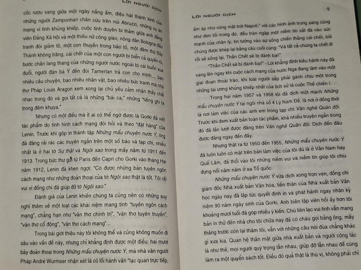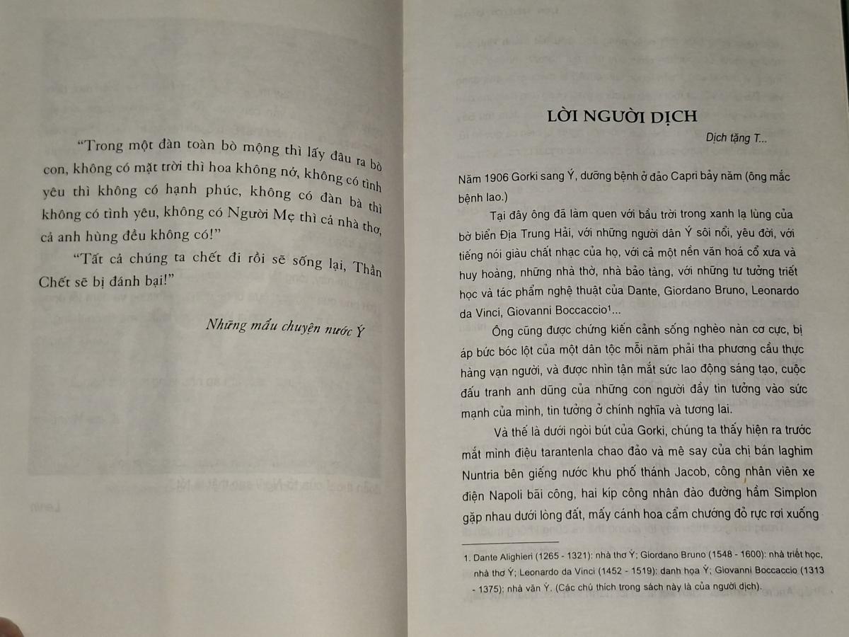 Dứơi ngòi bút của Gorki , chúng ta thấy hiện ra trước mắt mình điệu tarantenla chao đảo và mê say của chị bán laghim Nuntria bên giếng nước khu phố thánh Jacob , công nhân viên xe điện Napoli bãi công , hai kíp công nhân đào đường hầm Simplon gặp nhau dứơi lòng đất , mấy cánh hoa cẩm chướng đỏ rực rơi xuống cốc rượu vang giữa một ngày nắng ấm , điệu hát thành kính của những người Zamponhari chăn cừu trên núi Abruzzi , những vụ án mạng vì tình khủng khiếp , cuộc tỉnh duyên bi thảm giữa anh đảng viên Đảng Xã Hội và một thiếu nữ công giáo , nông dân Bologna đấu tranh đòi giàm tô , một con thuền trong bão tố , một đêm