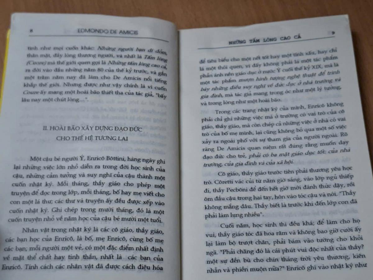 Qua những trang nhật ký sâu sắc của En-ri-cô, cuộc sống quanh cậu hiện lên đầy màu sắc tươi vui và mới mẻ. Mở đầu cuốn nhật ký là hình ảnh những bạn bè của En-ri-cô, mỗi ngày qua đi, cậu càng học hỏi nhiều ở họ. Cậu yêu họ bằng những tình cảm chân thành và kính phục nhất. Họ không chỉ là những người bạn đơn thuần, mà họ còn là những tấm gương sáng về lòng tốt cho cậu noi theo. Họ học giỏi mà không kiêu căng, khỏe mạnh mà luôn bênh vực yếu. Tuy sống trong nghèo khổ và bệnh tật nhưng họ vẫn chăm chỉ vươn lên vì lí tưởng và mục đích cao đẹp. Không những thế, những lá thư của bố mẹ hay truyện đọc hàng tháng, được cậu bé viết lại và bày tỏ cảm xúc một cách chân thành. Những chuyến đi thăm bạn bè, người nghèo đều cho thấy nghị lực của họ thật đáng khâm phục. Một năm học đã trôi qua, En-ri-cô đã học được nhiều điều từ họ để tiếp tục hoàn thiện bản thân mình. Đọc tác phẩm, độc giả sẽ hiểu được một chân lí: cần có một tấm lòng để bao dung và rộng lượng với mọi người xung quanh.