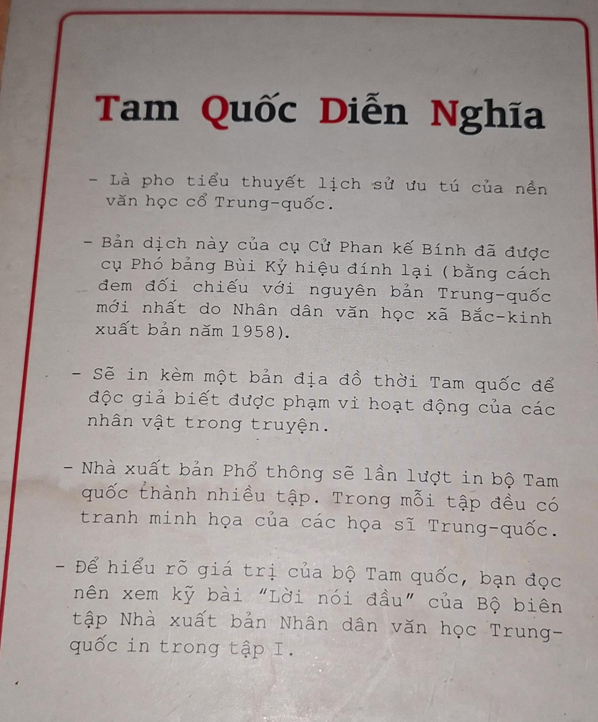 Văn học cổ Trung Quốc. Bản dịch này của cụ Cử Phan kế Bính đã được cụ Phó bảng Bùi Kỷ hiệu đính lại (bằng cách đem đối chiếu với nguyên bản Trung Quốc mới nhất do Nhân dân văn học xã Bắc - Kinh xuất bản năm 1958). Đặc biệt tập sách còn có "Lời nói đầu" của Bộ biên tập Nhà xuất bản Nhân dân văn học Trung - Quốc. Nhà xuất bản Phổ thông sẽ lần lượt in bộ Tam quốc thành nhiều tập. Trong mỗi tập đều có tranh minh họa của các họa sĩ Trung - Quốc.