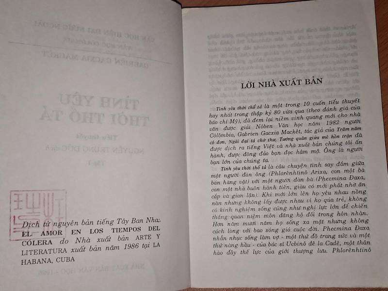 TÌNH YÊU THỜI THỔ TẢ ( trọn bộ 2 tập ) - NGUYỄN TRUNG ĐỨC dịch ; NXB VĂN HỌC 1995 ; 700TRANG ; KHỔ 13X19 .