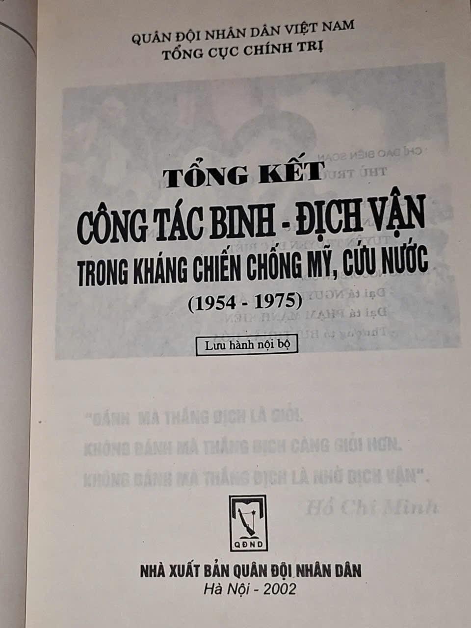 Tổng kết công tác binh - địch vận trong kháng chiến chống Mỹ, cứu nước ( 1954 -1975 ) - NXB QUÂN ĐỘI NHÂN DÂN 2002 , 300 trang, khổ 15x22cm