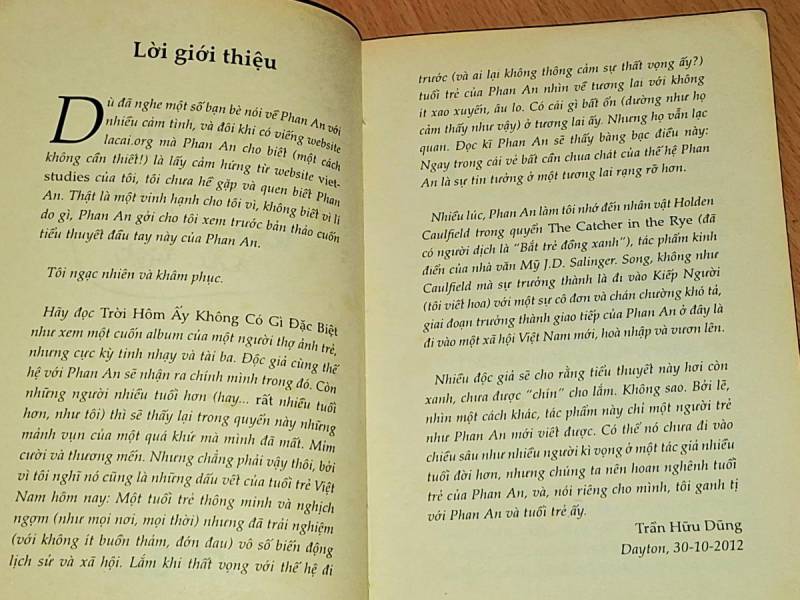 Hãy đọc Trời Hôm Ấy Không Có Gì Đặc Biệt như xem một cuốn album của một người thợ ảnh trẻ, nhưng cực kỳ tinh nhạy và tài ba. [...] Nhiều lúc, Phan An làm tôi nhớ đến nhân vật Holden Caulfield trong quyển The Catcher in the Rye (đã có người dịch là “Bắt trẻ đồng xanh”), tác phẩm kinh điển của nhà văn Mỹ J.D. Salinger. – GS Trần Hữu Dũng, Đại học Wright, Ohio, Hoa Kỳ.