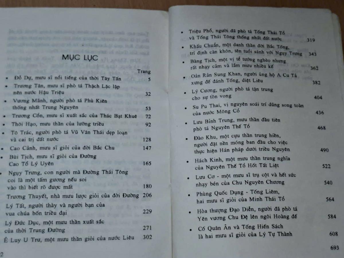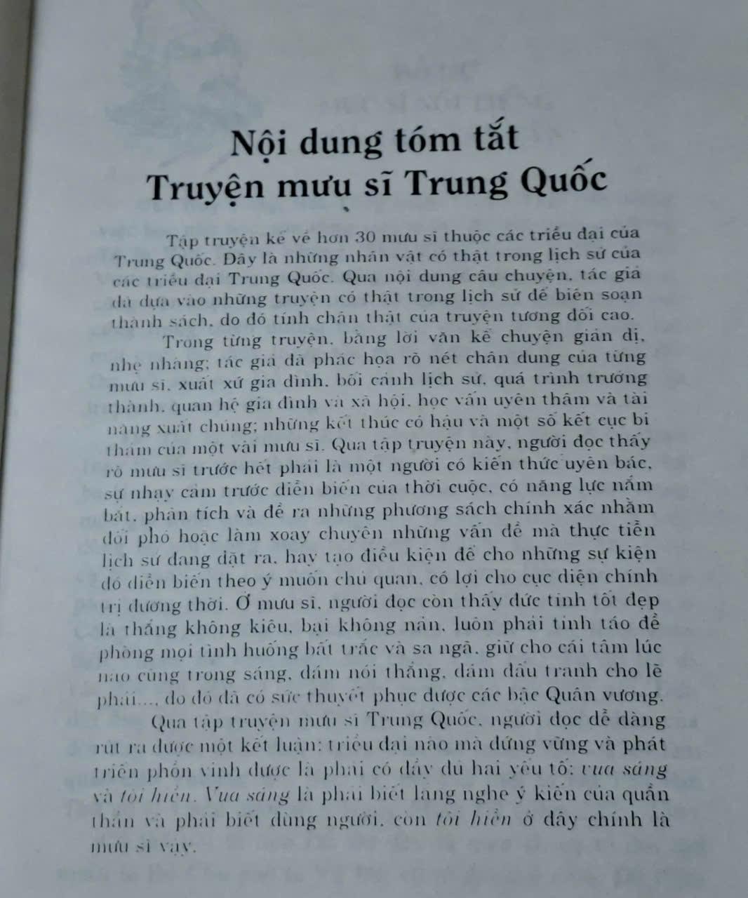 Tập truyện kế vé hơn 30 mưu sĩ thuộc các triều đại của Trung Quốc. Đây là những nhân vật có thật trong lịch sử của các triều đại Trung Quốc. Qua nội dung câu chuyện. tác giả đã dựa vào những truyện có thật trong lịch sử để biên soạn thành sách, do dó tính chân thật của truyện tương đối cao.