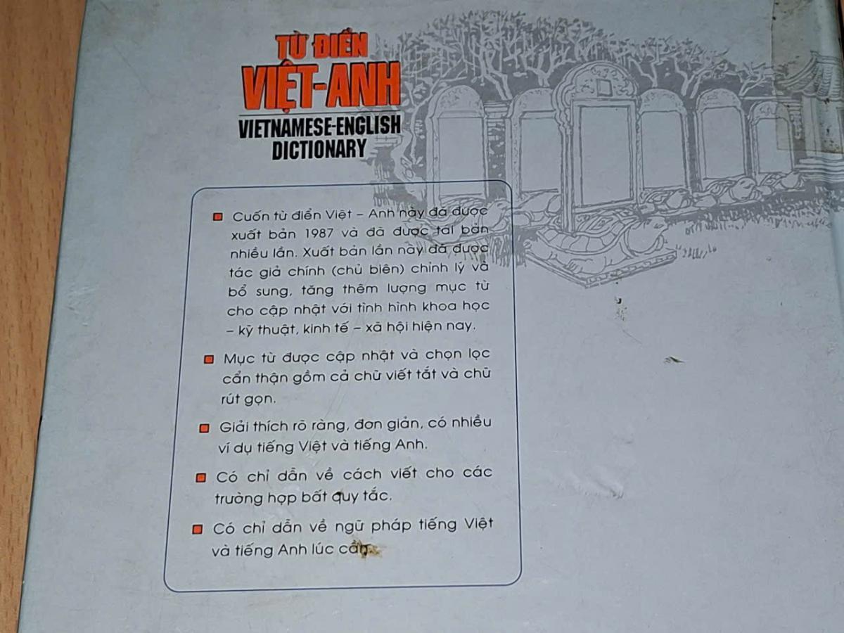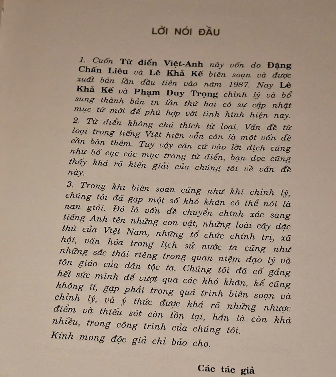 Trong mọi công việc thuộc bất kỳ lãnh vực nào thì Ngoại ngữ cũng luôn là vấn đề cần thiết cho mọi người. Để đáp ứng nhu cầu đó, xin trân trọng giới thiệu cuốn sáchTừ Điển Việt - Anh do các tác giả Đặng Trấn Liêu - Lê Khả Kế - Phạm Duy Trọng biên soạn và được Nhà Xuất Bản TP. Hồ Chí Minh ấn hành nhằm phục vụ bạn đọc . Trong lần tái bản này cuốn từ điển đã được các tác giả sửa chữa những sai sót trong các lần trước và cập nhật mục từ mới để phù hợp với nhu cầu hiện nay cho các ngành khoa học - kỹ thuật , kinh tế - xã hội... Ngoài ra, mục từ được cập nhật và chọn lọc cẩn thận gồm cả chữ viết tắt và chữ rút gọn, giải thích rõ ràng, đơn giản, có nhiều ví dụ tiếng Việt và tiếng Anh, có chỉ dẫn về cách viết cho các trường hợp bất quy tắc, có chỉ dẫn về ngữ pháp tiếng Việt và tiếng Anh lúc cần... g.
